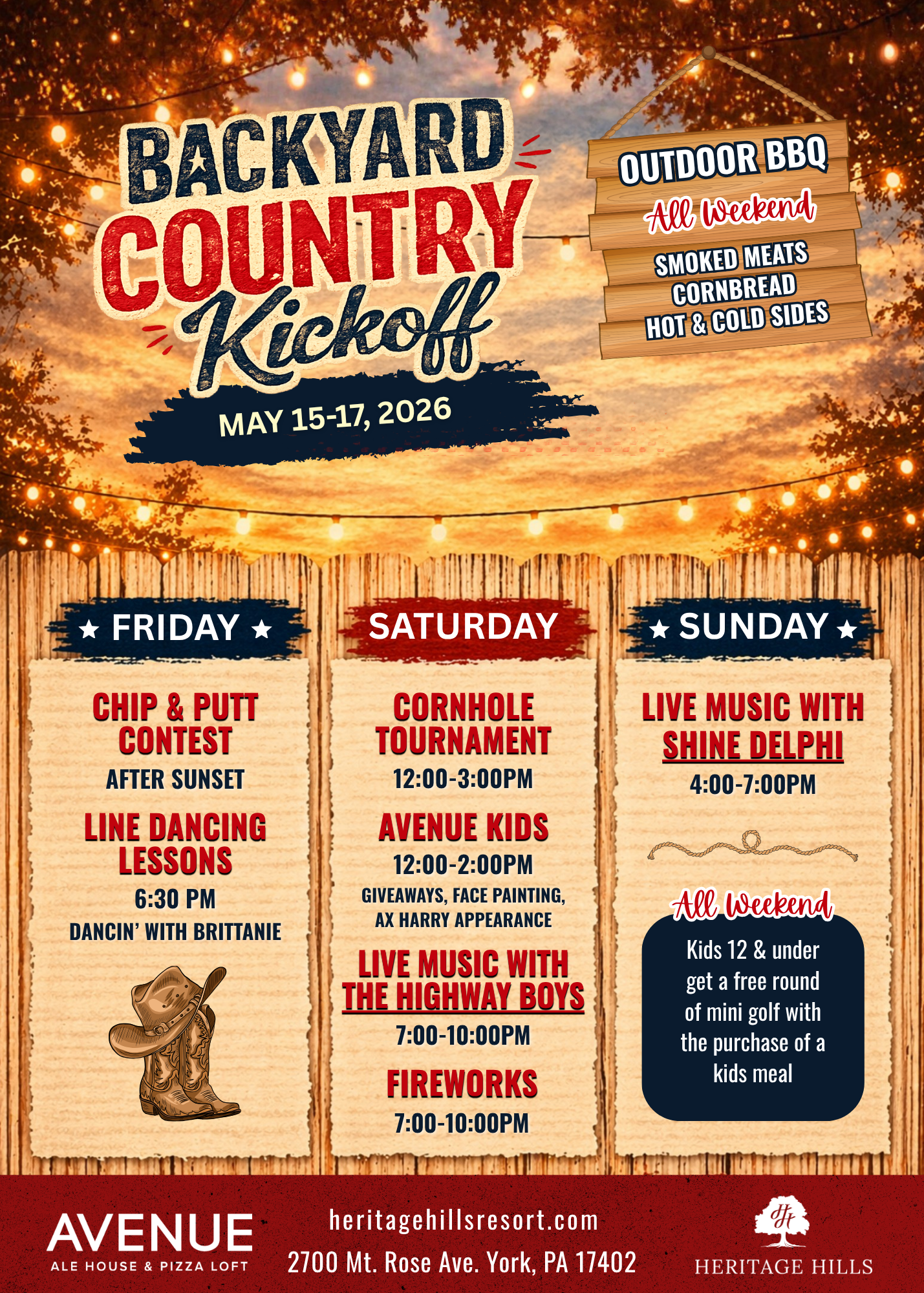 Get ready to kick off summer in true country style at the Backyard Country Kickoff at Heritage Hills Resort in York, PA! Join us May 15–17, 2026 for a full weekend of live music, outdoor BBQ, family-friendly activities, and fireworks at the Avenue Ale House patio.